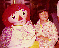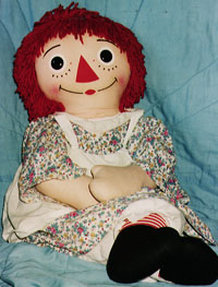 This is "Big Raggie". Santa brought her to me in 1976, when I was 6 years old. What a great surprise she was! I still look back on that Christmas with very special memories. Imagine my surprise to wake up on Christmas morning, and see her smiling at me under the tree. She was the largest Raggedy Ann doll I had ever seen at the time, and is still the largest of my collection. Because of her size, I've always imagined that she must be full of wisdom, and watches over all of the other dolls in the room. Big Raggie is about 45 inches tall, which was about the same size as I was when I first got her. I remember wearing her dress, pantaloons, and apron on halloween the next year.