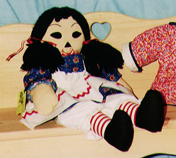 This is "Kristin". You may wonder why her name isn't the traditional "Raggedy Ann". (After all, isn't this the Raggedy of the Month page?) Well, as you can see, Kristin is not a traditional Raggedy Ann. She is a hand-made Chinese version of Raggedy Ann that was given to me as a Christmas gift by my Aunt Lani in 1976. My mom suggested that I give her a special name, since she was such a special doll. We both thought it would be appropriate to name her "Kristin", which is my middle name.